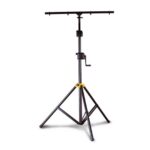 El soporte de iluminación HERCULES Gear Up LS700B cuenta con el sistema Gear Up Quik-N-EZ, una barra en T cuadrada con clip para facilitar el montaje y una construcción de patas de trípode de doble refuerzo.