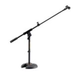 El soporte de micrófono de bajo perfil HERCULES MS120B con brazo telescópico es ideal para aplicaciones de batería y amplificador.